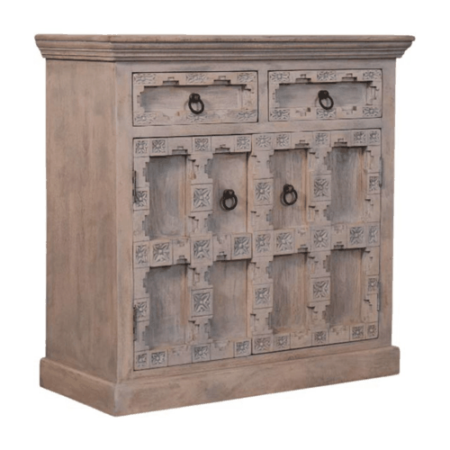 The design includes two upper drawers, providing convenient storage for smaller items. These drawers are adorned with antique-style ring pulls, adding a touch of historical charm while ensuring ease of use. Below the drawers, the spacious cabinet offers ample room to store linens, tableware, or household essentials, making it a versatile piece for any room. Whether placed in a dining room, entryway, or curated interior space, the Jaipur Lattice Sideboard seamlessly blends cultural heritage with practical elegance.